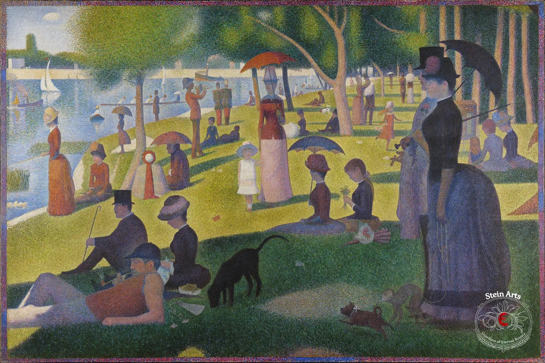 In diesem monumentalen Werk erreichen diese Untersuchungen eine außergewöhnliche Synthese. Die Oberfläche der Leinwand verwandelt sich in ein Geflecht winziger Farbpunkte, das eine nahezu atmosphärische Leuchtkraft hervorbringt, während die Figuren – Spaziergänger, Bootsleute, elegante Damen und Kinder – in einer stillstehenden, beinahe zeitlosen Atmosphäre zu verweilen scheinen. Das Ergebnis ist eine Szene, die zugleich alltäglich und rätselhaft wirkt, in der das moderne Leben mit der Präzision eines visuellen Experiments beobachtet erscheint.